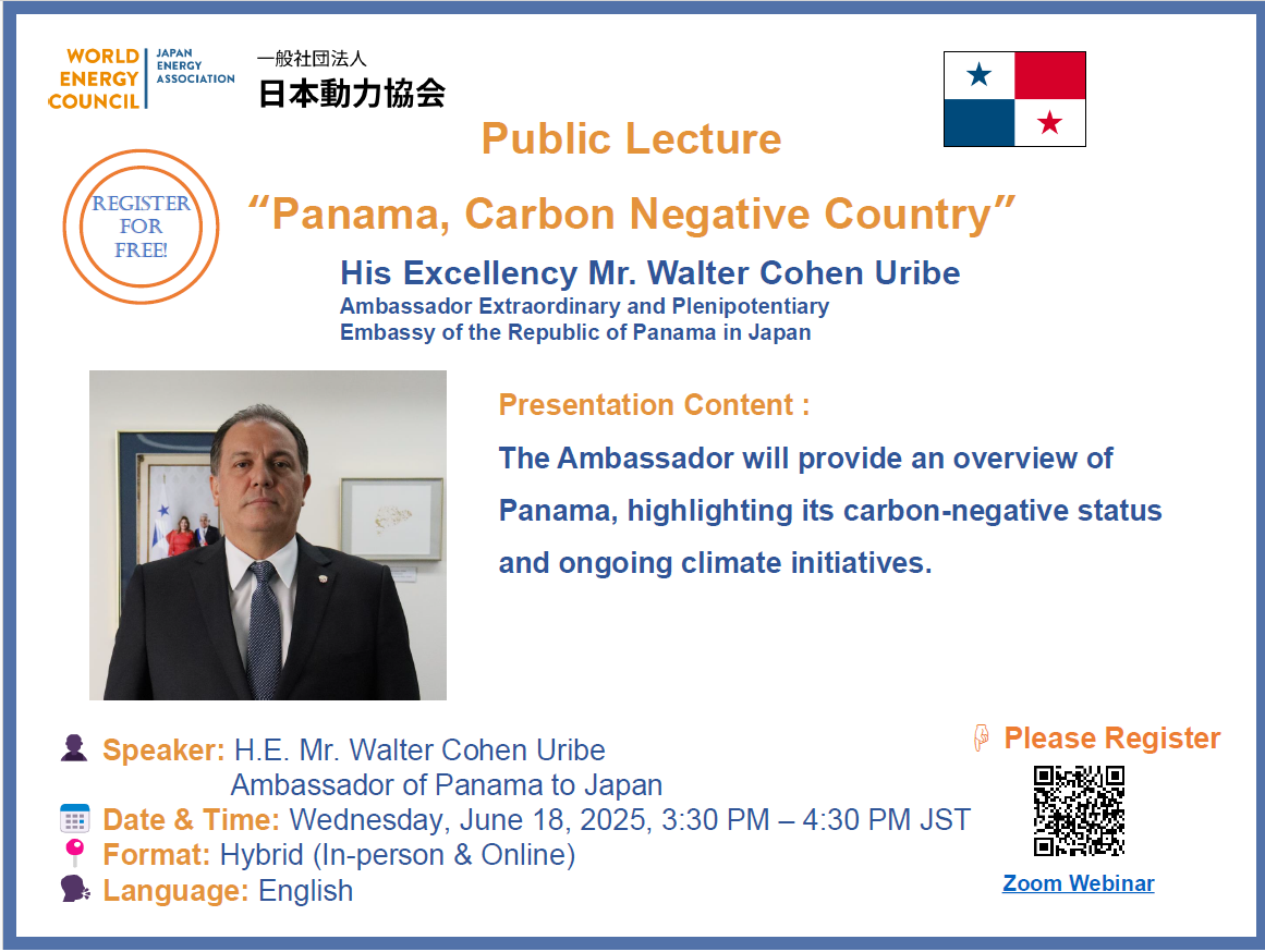 Join us for a special public lecture featuring His Excellency Mr. Walter Cohen Uribe, Ambassador of Panama to Japan. This session will offer an in-depth look at Panama’s achievements as a carbon-negative country and its proactive climate initiatives. Participants will gain insights into how Panama leads by example in the global fight against climate change. The event will be held in English and is open to both in-person and online attendees.